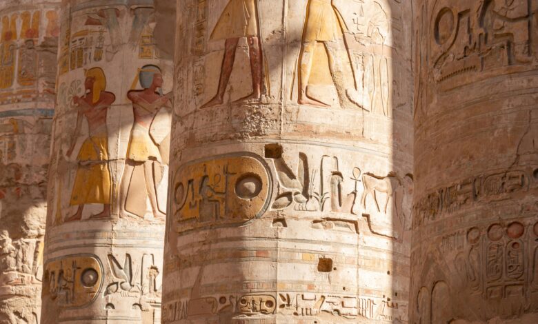 • التجريد العضوي للأعمدة: لم تكن الأعمدة مجرد ركائز حاملة بل كانت استعارة حجرية لبيئة النيل، حيث تم ابتكار طرز معمارية مستوحاة من البردي واللوتس والنخيل، مما حول الصالات المسقوفة الى غابات حجرية تتفاعل مع الضوء والظلال ببراعة.